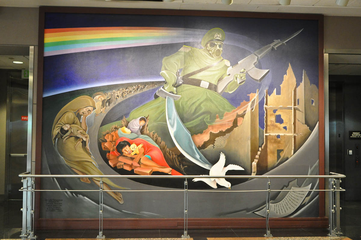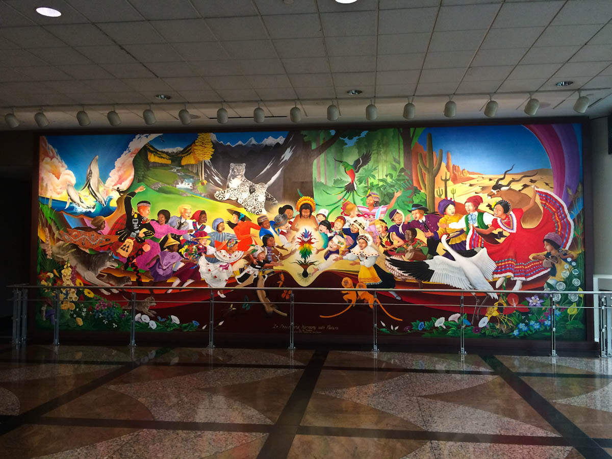 Plaque explaining the mural:Children of the World Dream of Peace is a powerful mural expressing the artist’s desire to abolish violence in society. One section of the piece speaks to the tragedy and devastation of war and its impact on humanity. The mural then moves on to images of smiling children, dressed in traditional folk costumes from around the world, celebrating peace prevailing over war.” Detail: Children of the World Dream of Peace, by Leo Tanguma Detail: Children of the World Dream of Peace, by Leo Tanguma Detail: Children of the World Dream of Peace, by Leo Tanguma Detail: Children of the World Dream of Peace, by Leo Tanguma Detail: Children of the World Dream of Peace, by Leo Tanguma Detail: Children of the World Dream of Peace, by Leo Tanguma
