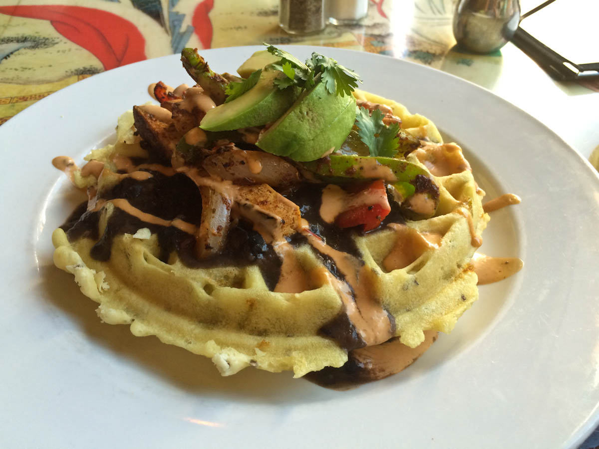 I was busy with work stuff the rest of the day, but the next morning awoke once again at the crack of dawn. City O’ City’s menu called to me on the 21st floor of my hotel room and I found myself wandering again, this time pondering the waffles I had seen on the menu. They make savory waffles. Waffles as food-food. This is perhaps the best idea ever. I ordered the “waffle of the week”, a tex-mex waffle topped with black beans, spicy peppers and onions, cilantro, a chipotle aioli, and avocado. It was one of the best meals I have ever had. Seriously.