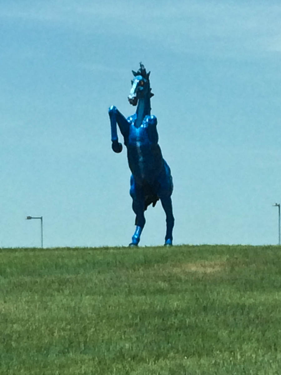 The airport is fairly far outside of the city, about 25 miles, and by Saturday afternoon we were all conferenced-out. I decided to leave a bit early with my boss and a colleague so I could explore the weird murals in what is a very weird airport. According to conspiracy experts, the airport is everything from a massive underground base providing safety to a new world order to a secret Nazi and/or Freemason site. It would appear there is an entire segment of the internet devoted to the DIA conspiracy (go ahead, Google it!). No matter what tin hat you are wearing, the airport is simply weird. Greeting you as you arrive at DIA is a giant blue horse sculpture with red glowing eyes dubbed Blucifer…that killed the sculptor. Seriously, you can’t make this stuff up.