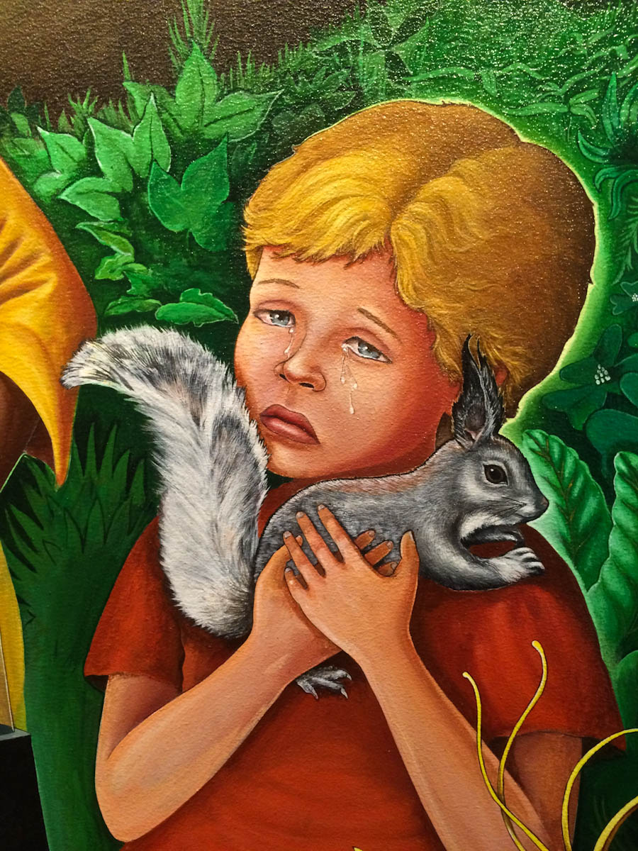 Inside the baggage claim area are four wildly colorful murals by Chicano muralist Leo Tanguma that promote world peace and express fears of mass extinction, but first you have to get past a giant, threatening gas mask-wearing, sword wielding figure and a lot of dead and crying kids to get the message. The images show misery and death, a quote from a child who died at Auschwitz, a dead jaguar, and kids toppling the gas mask figure. I just can’t figure out how this got past a public art planning committee. I wonder what weary travelers make of these scenes? Here are the four murals and some close ups: