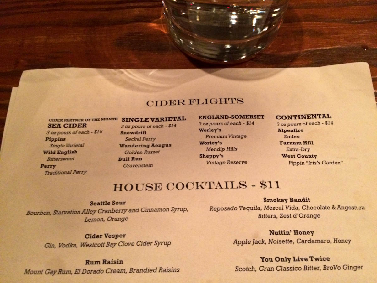 Capital Cider – I happened to Google “gluten-free Seattle” and found out about Capital Cider. Their menu was entirely gluten-free, they had what appeared to be vegan options, and best of all, they served cider flights. I asked my boss if he wanted to check it out and he said yes. Then another person joined us, and someone she was talking with and another two chimed in and soon a group of seven was seated in the lower level of the restaurant and bar. It was “Drink and Draw Night” which turned out to be rather enjoyable. I know I had hand cut fries and some Brussel sprouts, and maybe some broccoli, all of which were quite tasty, but the drinks are what really mattered. I had a flight of ciders, all of which were a bit dry for me, and a delightful mixed drink made with Scotch, Gran Classico Bitter, and BroVo Ginger. The outstanding part of the meal came when I realized they had flights of dessert ciders – like port made with apples. They were amazing.