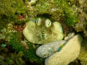 On our final morning, we walked over and I went straight for the three rocks. I was so hoping that I would finally get to see an octopus in the wild, but also realistic enough to know that I had been looking for one for well over a decade. I found the third rock. I found the sea urchin. And then I found the octopus. I was so excited I started making honking noises with my snorkel. I spent about 15-20 minutes circling the octopus rock. He watched me and I watched him. I could see why I didn’t notice him before. He camouflaged himself perfectly and added some rocks near his entrance that looked just like him. I was giddy.