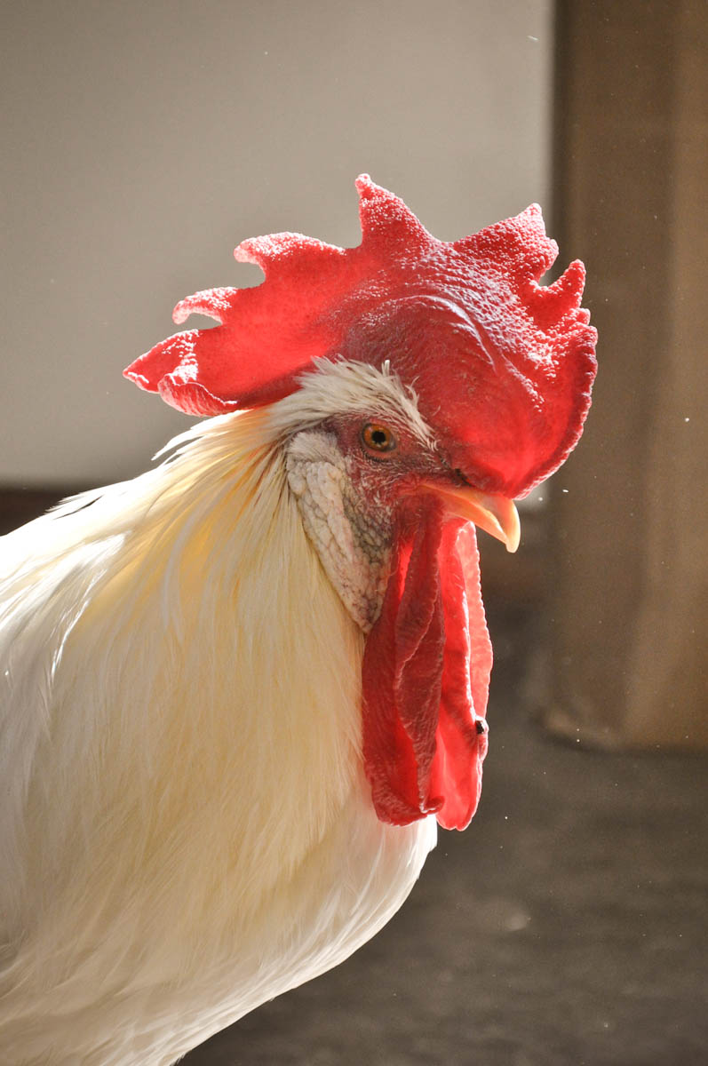 Rajij’s story: “Rajij is our 827th rescue. He is a timid juvenile Malay, probably born in December 2011. No spurs, barely a bump on his ankles. He and his brother Satar were discovered by police during a drug bust in North Minneapolis, each locked in a dark basement closet. They were both remarkably calm, quiet and healthy despite having plenty to protest about their life so far. They were constant companions at CRR. Satar passed away in 2013 and Raj grieved for him for a very long time. Raj is now our senior resident rooster and reviews his troops every morning with a powerful sense of duty and eagerness to serve. He loves having his head groomed, we keep a comb handy to preen him and keep those feathers gorgeous.”