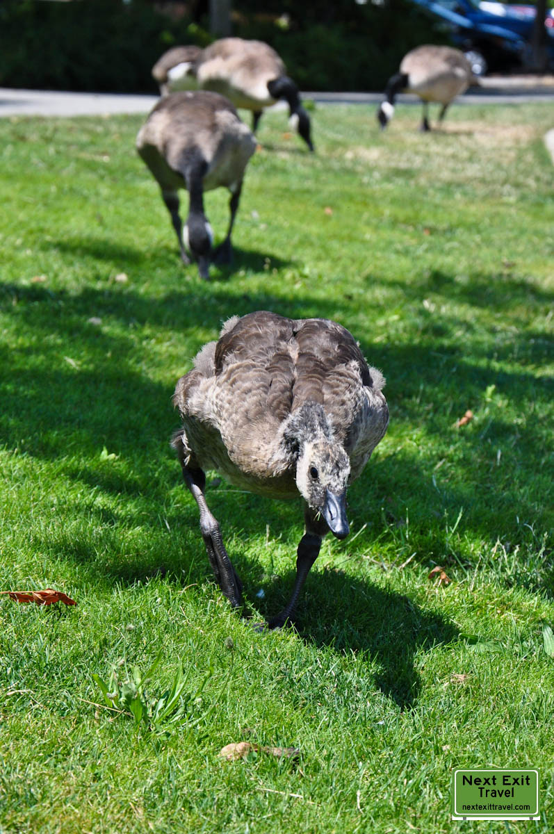 The one goose, who seemed completely at ease with me, began honking what sounded like a warning cry. I was confused and looked around to see what was causing the distress. I noticed the ducks, who had been scattered around the park, starting to congregate in the man-made pool. And then I looked up.