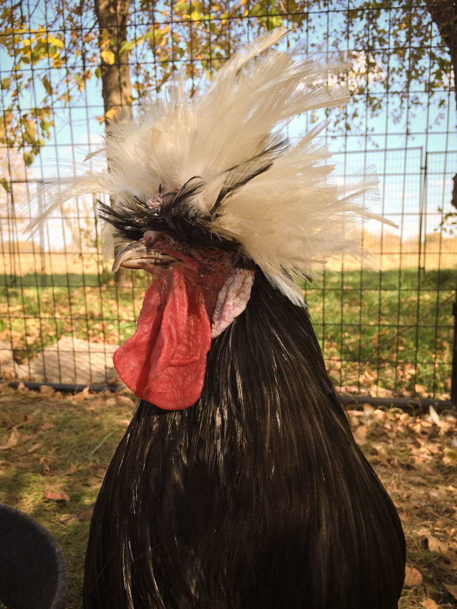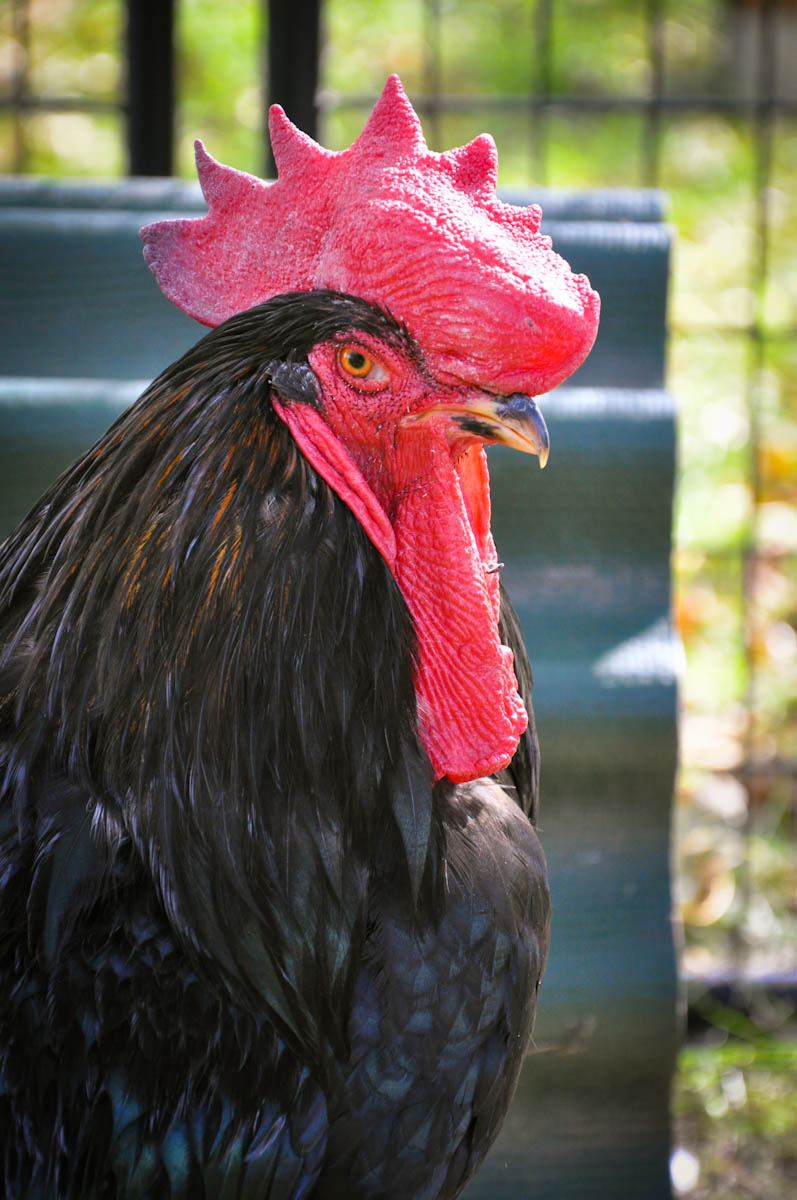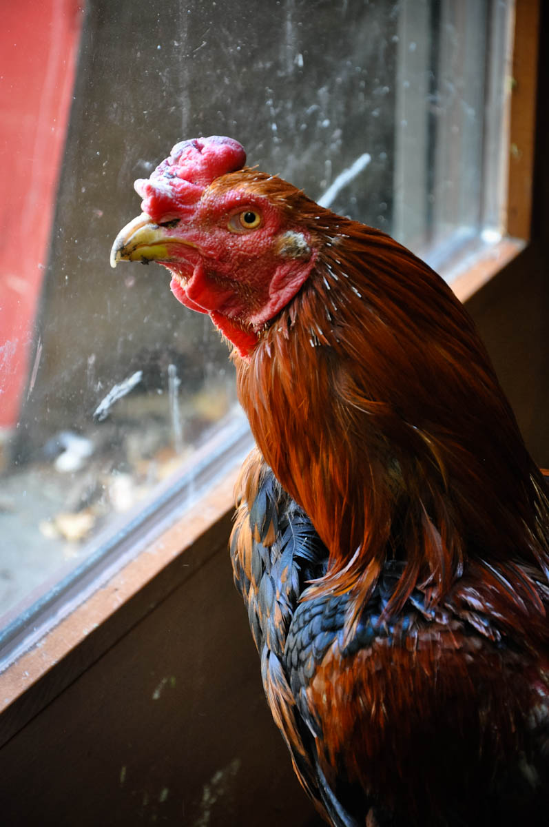 Rajij’s story: “Rajij is our 827th rescue. He is a timid juvenile Malay, probably born in December 2011. No spurs, barely a bump on his ankles. He and his brother Satar were discovered by police during a drug bust in North Minneapolis, each locked in a dark basement closet. They were both remarkably calm, quiet and healthy despite having plenty to protest about their life so far. They were constant companions at CRR. Satar passed away in 2013 and Raj grieved for him for a very long time. Raj is now our senior resident rooster and reviews his troops every morning with a powerful sense of duty and eagerness to serve. He loves having his head groomed, we keep a comb handy to preen him and keep those feathers gorgeous.”
