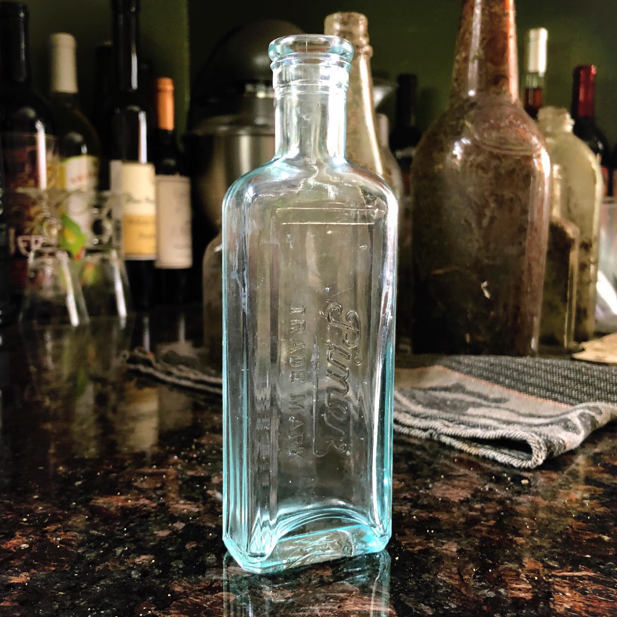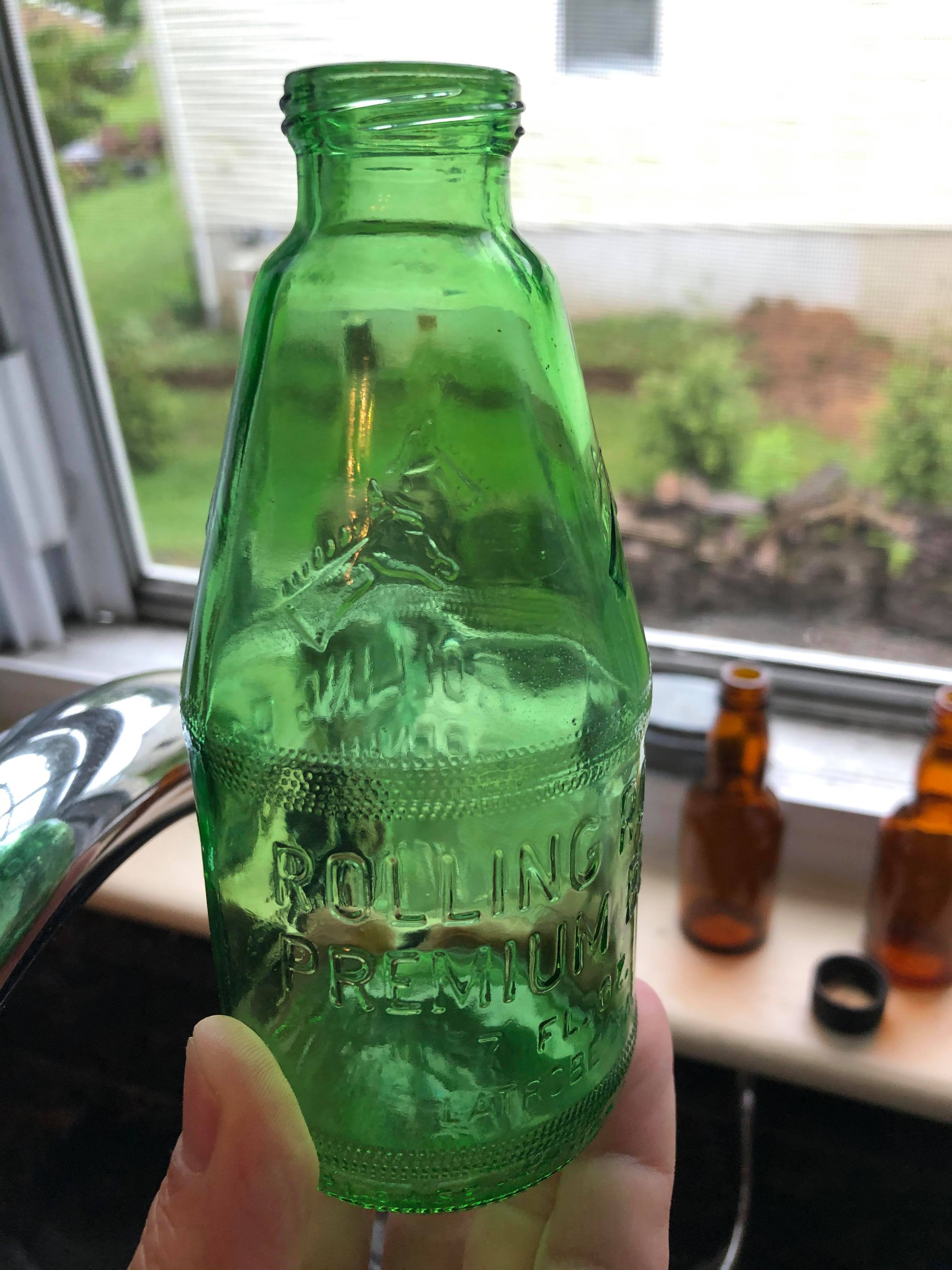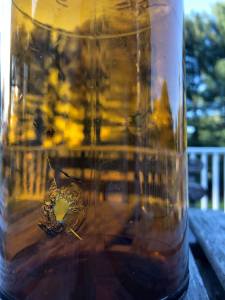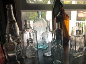 Some three dozen trash bags later, and with the roadside now clean enough to draw the occasional encouraging honk from passing cars, we turned our attention inward, beyond the tree line, into the woods. More fifths, and four-fifths, gallons and full pints – the cast-off bones of clandestine late-night benders. The more interesting ones – embossed or easily identified brands; unique shapes, sizes, and colors; unfamiliar names – come home with us.